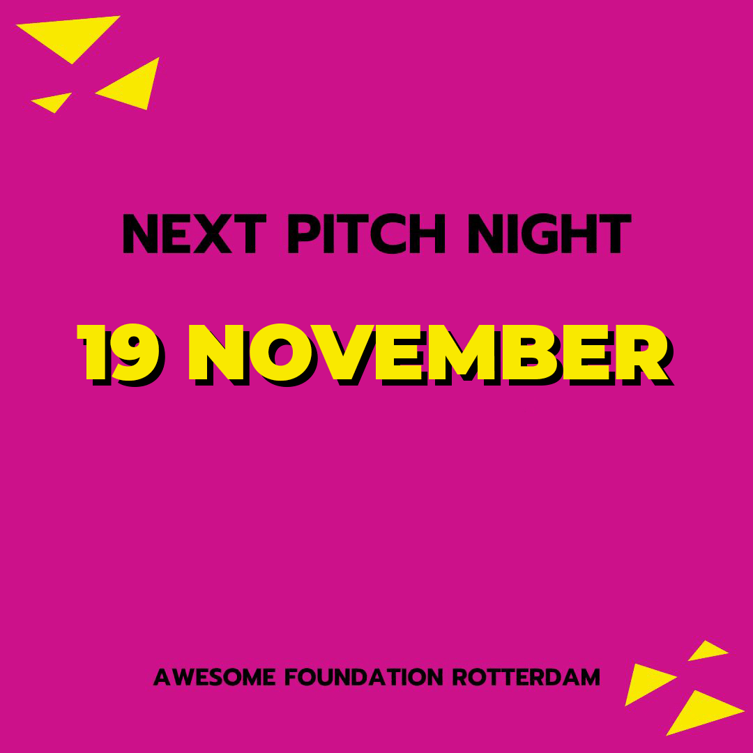 Ready for some more awesomeness? Our next Pitch Night is on November 19th at this location! Let’s make Rotterdam more awesome and send in your idea now! We select the most awesome ideas that make our city of Rotterdam more fun/nice/social/sustainable. The winner goes home with €1.000...